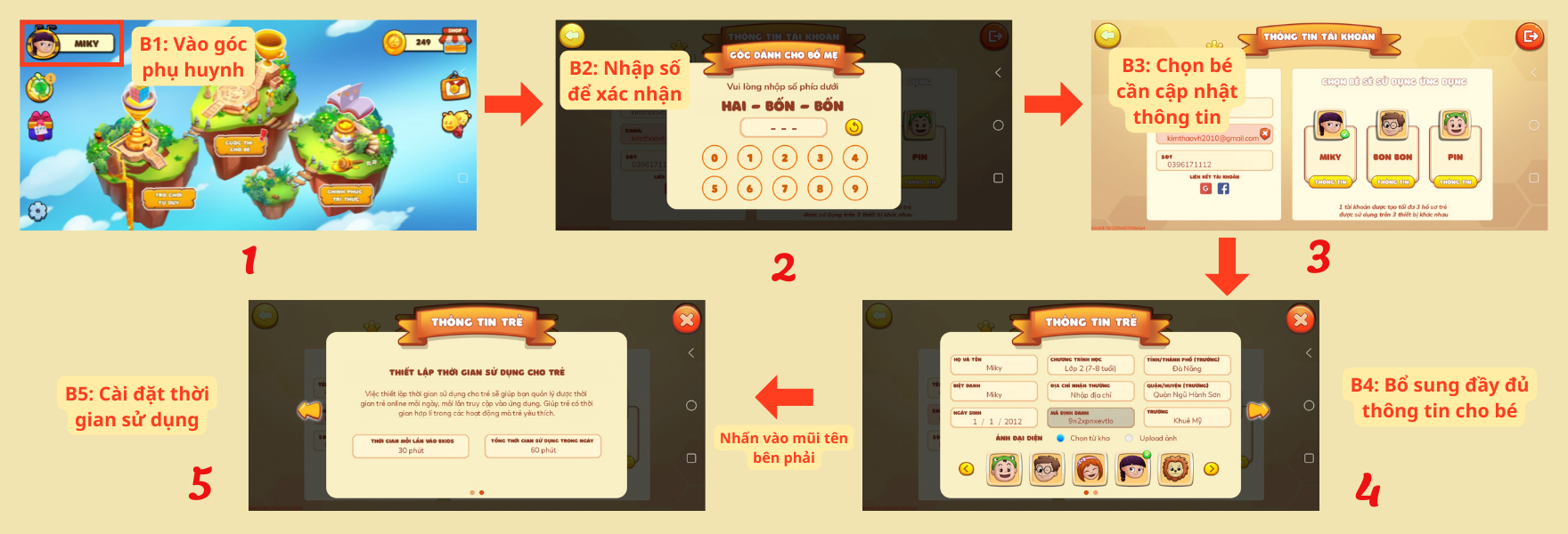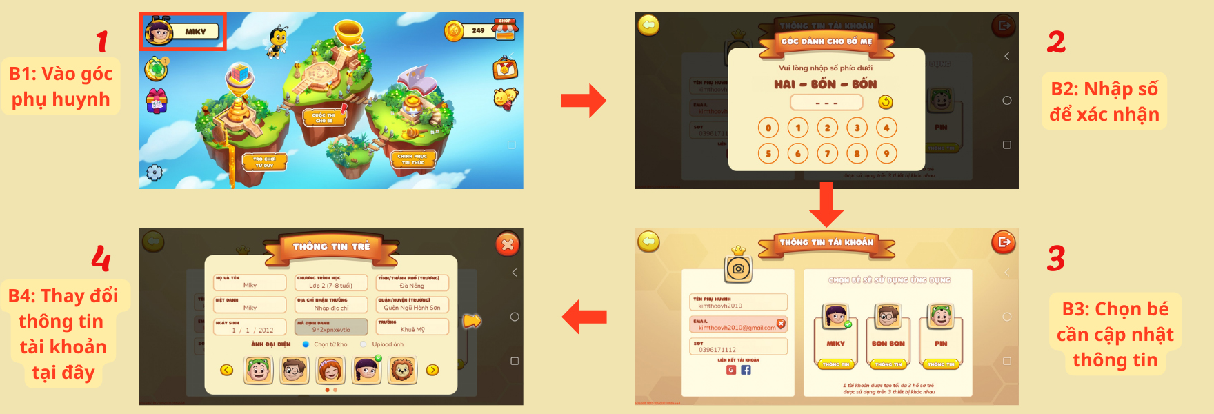Bạn cần cập nhập thông tin của bé trong ứng dụng đúng với thông tin đã đăng ký. Cập nhập thông tin của bé theo các bước dưới đây.