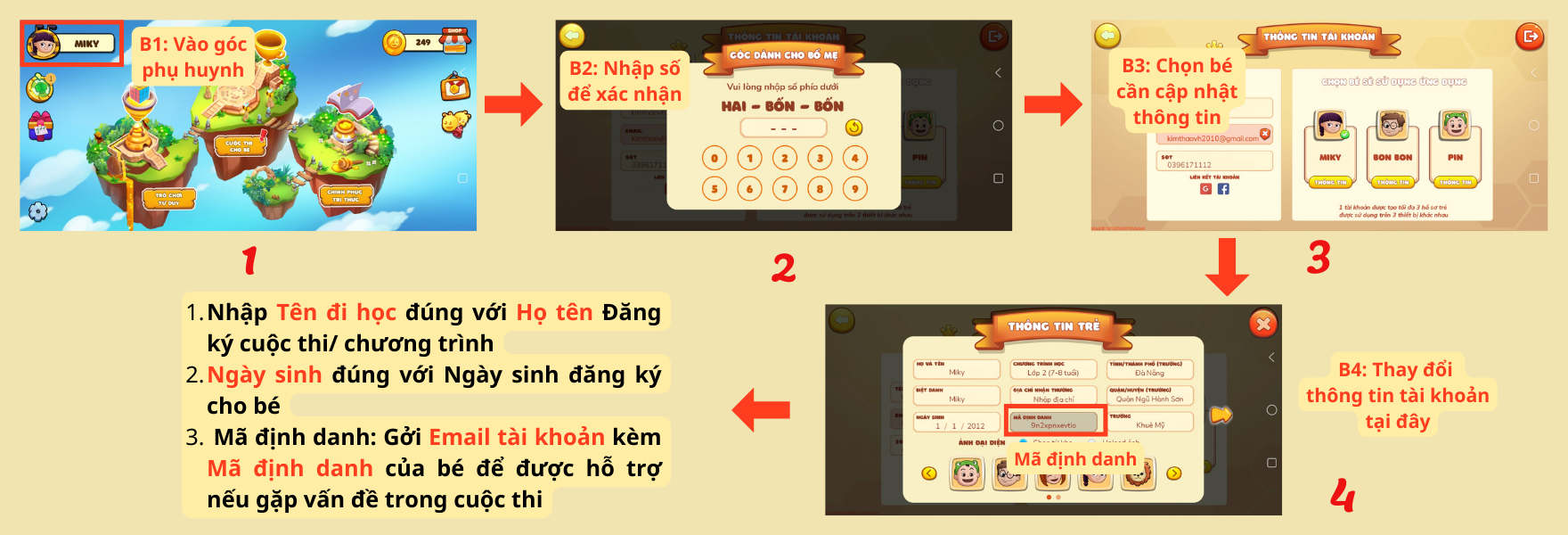 Mỗi bé sẽ có 1 mã định danh khi sử dụng ứng dụng. Mã định danh được dùng để tham gia vào các cuộc thi.