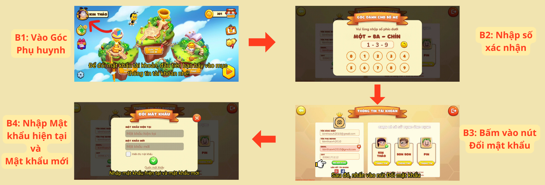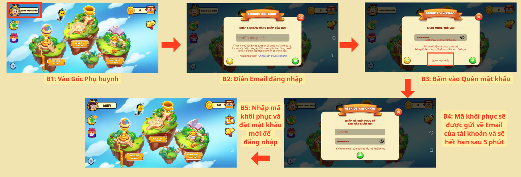 Chọn Quên mật khẩu/Đổi mật khẩu theo hướng dẫn dưới đây. Beekids sẽ gửi email kèm mã khôi phục để hỗ trợ bạn đổi mật khẩu mới. Hãy lưu ý rằng mã khôi phục sẽ hết hạn sau 5 phút.